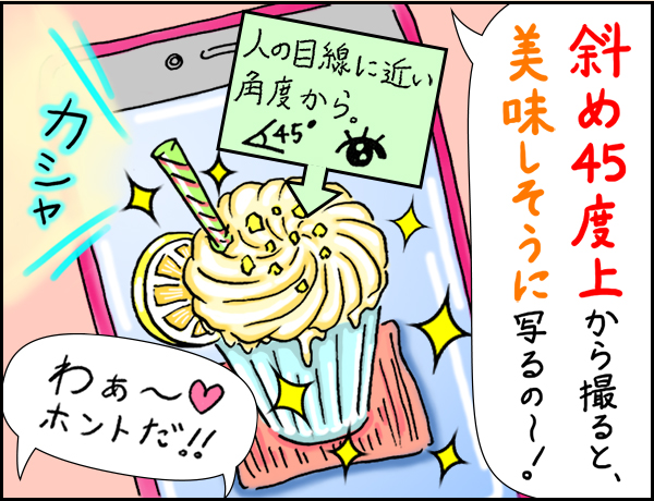 普段と同じ目線の写真は、リアリティを感じやすく、より美味しさが伝わります。斜め45度を意識して、主役にピントを合わせて撮影してみましょう。周りの小物は、うるさくならない程度にさりげなく入れると、主役が引き立ちます。