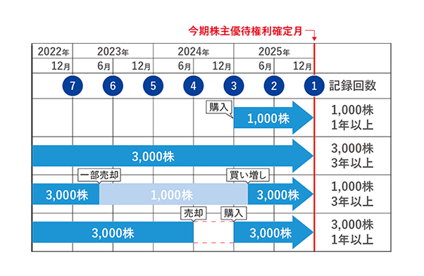 「3年以上」継続保有とは、権利確定日(直近の12月31日)の当社株主名簿に記載または記録されており、3年以上継続して当社株式を保有(毎年6月30日、12月31日時点の当社株主名簿に同一の株主番号で7回以上連続して記載または記録)されていることといたします。