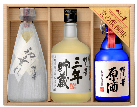「博多の華 むぎ 初垂れ」は、蒸留工程の最初に出てくる初留部分だけを取り出した、華やかな香りと、軽快さが特長の贅沢な焼酎です。「博多の華 三年貯蔵」は、厳選された大麦から造られた麦焼酎原酒を3年以上熟成させることで生まれる芳醇な香りと、樫樽由来のまろやかな味わいが特長の長期貯蔵焼酎です。「博多の華 原酒」は、原酒ならではの濃厚で奥深い味わい、芳醇な香りが楽しめます。