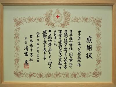 多くの株主の皆様からの寄付に対して、日本赤十字社より「社長感謝状」が授与されました。