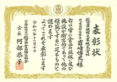 秋田県醗酵工業が「食品衛生優良施設」として秋田県食品衛生協会から表彰されました!