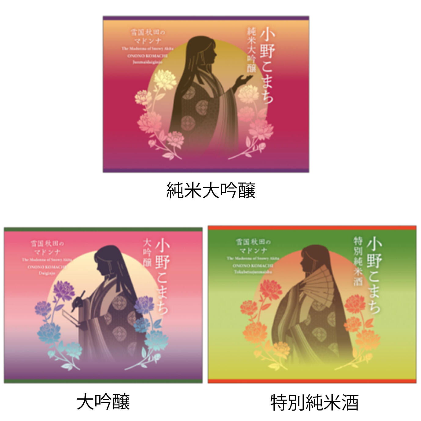 秋田の地酒「小野こまち」シリーズの3品が「小野小町」をイメージした高貴で華やかなラベルデザインへ大刷新!
